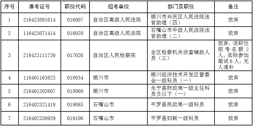 2026年全区考试录用公务员第一批次面试人员名单发布2日内,有个别考生自愿放弃面试资格。根据《宁夏回族自治区2026年考试录用公务员公告》相关规定,面试空缺名额由报考同一职位且笔试成绩在合格分数线以上的报考者从高分到低分依次递补。现将有关情况公告如下:
