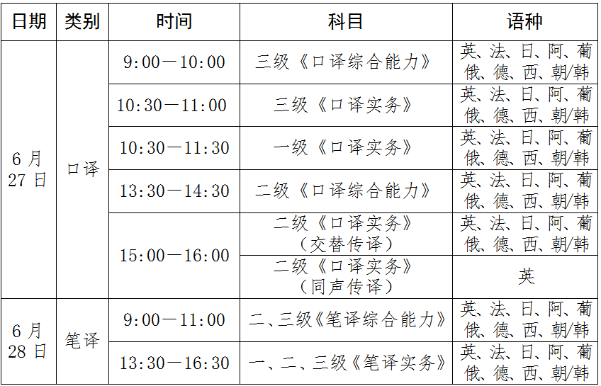 一级口译考试设《口译实务》1个科目,二、三级口译考试设《口译综合能力》和《口译实务》2个科目。其中,二级《口译实务》科目分设“交替传译”“同声传译”2个专业类别,目前仅英语同时开考“交替传译”“同声传译”,其他语种只开考“交替传译”。通过同声传译考试并符合相应任职条件的人员,可申报评审副高级职称。